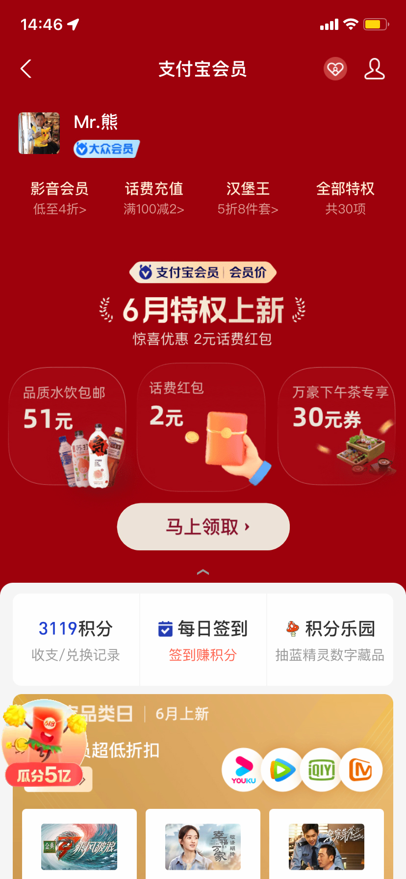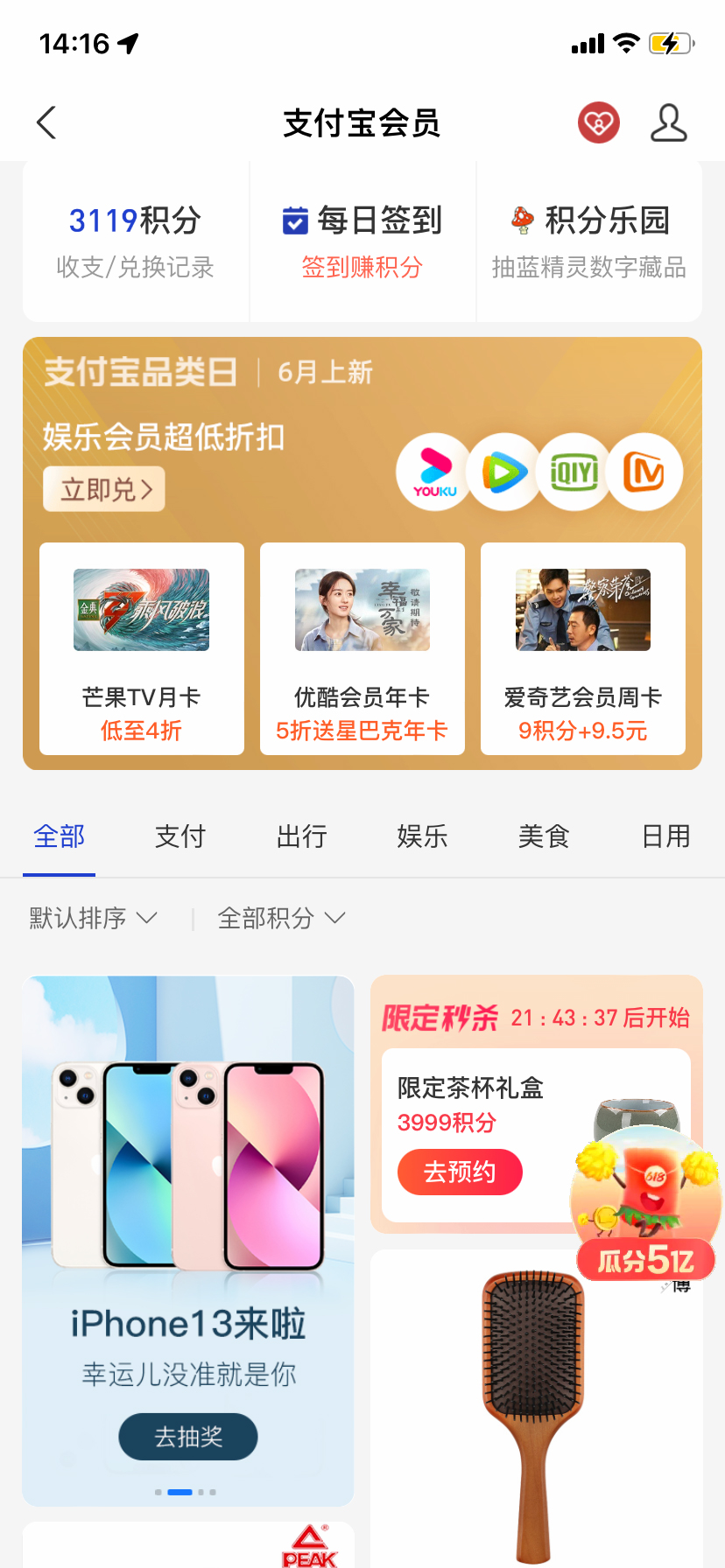 支付宝--“我的”--支付宝会员--首页下拉积分兑换FEEDS流常规坑位。