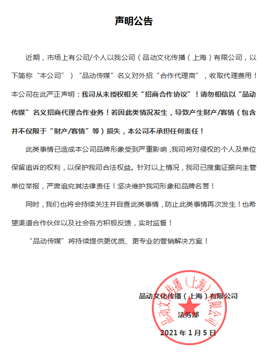 近期,市场上有公司/个人以我公司(品动文化传播(上海)有限公司,以下简称“本公司”)“品动传媒”名义对外招“合作代理商”,收取代理费用!本公司在此严正声明: